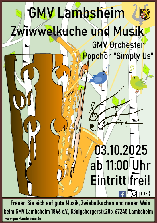 – dazu laden wir am 3. Oktober 2025 um 11 Uhr in die GMV-Halle ein. Freuen Sie sich auf Neuen Wein, Zwiwwelkuche und ein buntes Musikprogramm. Das GMV Orchester spielt mit Marsch, Polka, Samba und vielem mehr auf. Der GMV-Popchor „Simply Us“ unterhält mit Liedern aus dem aktuellen Konzertprogramm. Der Eintritt ist frei.