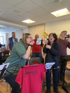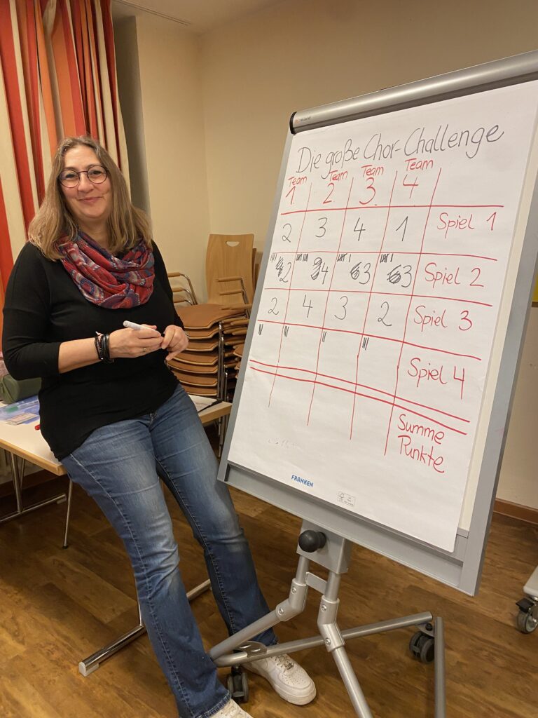 Neben konzentrierter Arbeit an neuen Songs und dem bestehenden Repertoire sorgten Anja und Martina am Freitagabend für eine mitreißende Chor‑Challenge. Notenständer-Aufbau im Wettkampfmodus und Liederraten nach nur einem Takt brachten reichlich Gelächter und Teamgeist.