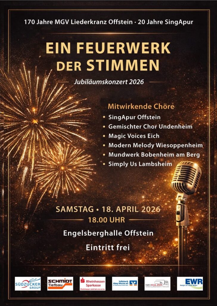 Musik verbindet – Musik schafft Freundschaften „Simply Us“, der GMV Popchor, beteiligt sich am Freundschaftssingen des MGV Liederkranz 1856 Offstein e.V. Der Pop- und Gospelchor SingApur lädt ein und wir kommen gerne. Anlass ist ein Doppeljubiläum: 170 Jahre MGV Liederkrank Offstein und 20 Jahre SingApur Veranstaltungsort ist die Engelsberghalle Offstein. Der Eintritt ist frei.