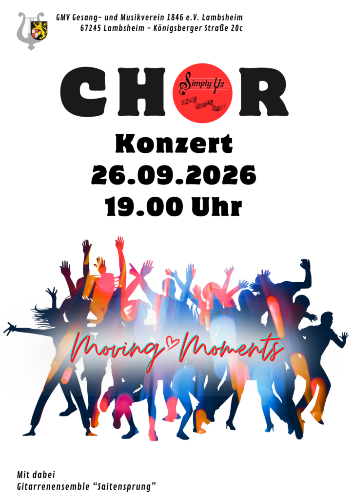 „Moving Moments“ – so lautet der Titel des diesjährigen Konzerts des Popchors „Simply Us“. Freuen Sie sich auf einen Abend, der bewegt und berührt. Save the Date: 26.092026, um 19 Uhr in der GMV-Halle in Lambsheim, Königsberger Straße 20C. Weitere Informationen folgen.